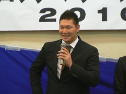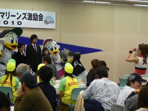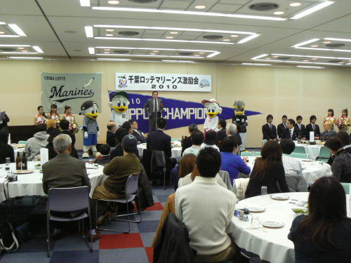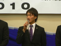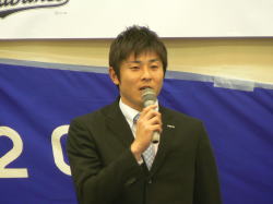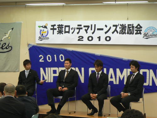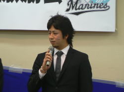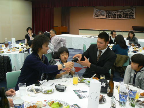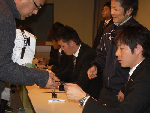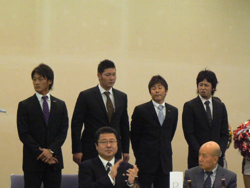 ![]() ![]() 大嶺投手はふた桁勝利を宣言! 山室投手は1軍定着を目標に! ![]() ![]() 神戸選手はレギュラー獲得を! 伊藤投手はフル回転で日本一を! 最後に来季の抱負を各選手が述べ、市原後援会からの激励の拍手で しめくくられました! |