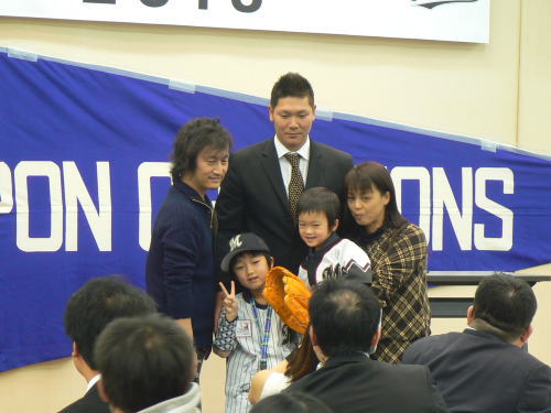 ![]() 落札したご家族が神戸選手と記念撮影!ピースサインも決まってます! |