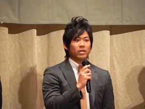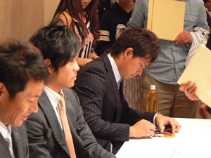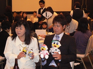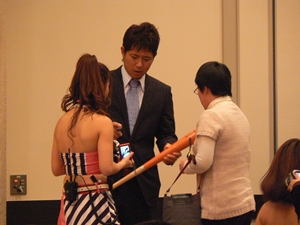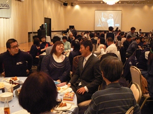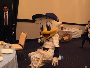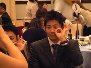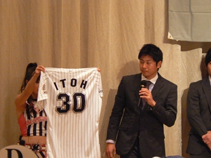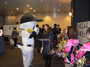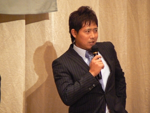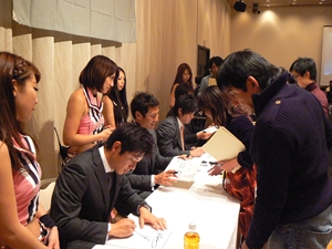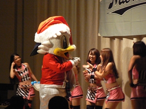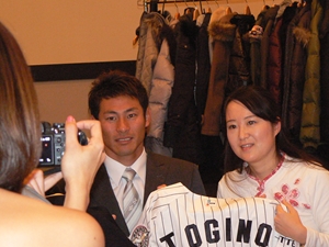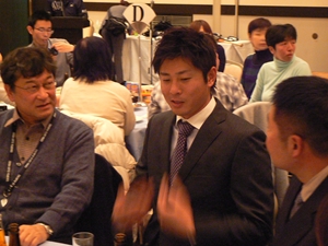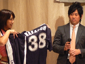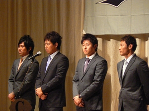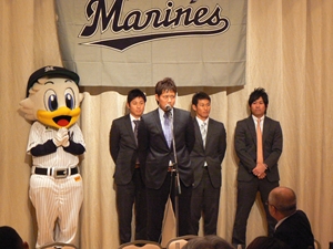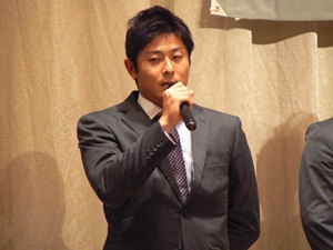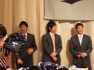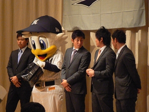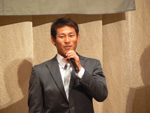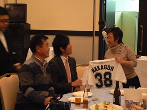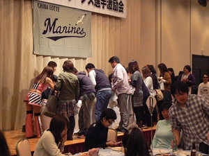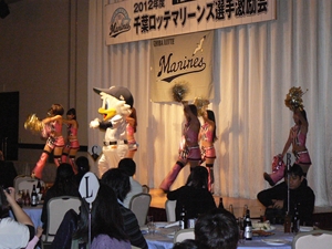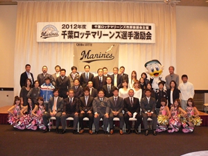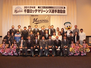 12月22日(土)五井グランドホテルにて、市原後援会選手激励会を開催しました。 今年の参加選手は塀内選手、伊藤選手、中郷選手、荻野貴選手の4名! ありがたいことに、今年も多くのお申込が殺到し、過去最多となる140名以上の方に 参加いただきました。 ◆ようこそいらっしゃいました!受付スタッフ ◆マーくん・Mスプラッシュもお出迎え! ◆オープニングダンスでシーズン中の熱気が ◆選手入場!まだちょっと表情の硬い4選手。 よみがえってきます! ◆恒例の席順抽選です!今年は全テーブル ◆憧れの荻野選手とツーショット! を回るので、スタートテーブルと座席を決める くじを引いてもらいました。 ◆塀内選手はマスコットぬいさんと共に! ◆中郷選手はサンタルックで記念撮影! ◆伊藤選手はOKポーズでお茶目に! ◆自分の背番号をつけたファンは嬉しいッスね! ◆身振り手振りでシーズン中のウラ話を ◆各テーブル3分という短い時間ではありま ファンと談笑です。 したが、選手たちの素顔に触れられた貴重な 時間でした。 ◆おっと!マーくん、あなた未成年でしょ!? ◆サンタマーくん!シーズン中は見られない姿! ◆来年はフルに活躍して優勝を! ◆来年は常時一軍&日本一! そして、4年連続で市原に…? 伊藤選手 中郷選手 ◆ケガをせず、1軍で日本一を迎えたい! ◆レギュラー定着して優勝に貢献! 荻野貴選手 塀内選手 ◆来年の抱負を一通り述べた後、お宝グッズ ◆伊藤選手シーズン中使用のユニフォーム! オークションが始まりました! 荻野選手のリュックにいきなり高値がつき 驚きの表情です! ◆中郷選手も汗のしみこんだ練習用ウェア! ◆塀内選手のバットを落札したファンと記念撮影! ◆そしてサイン会です! ◆一人一人、心を込めてサインしてくれました! ◆過去最多の参加者でしたので、時間も最長 ◆激励会の締めは参加選手代表塀内選手の 1時間弱のサイン会でした。選手の皆様 ご挨拶!「来季に期待してください!」 お疲れ様でした! みんなマリンに応援に行きますよ!! ◆最後にスタッフ一同記念撮影です! ご来場いただいたファンの皆様が喜んでくれて我々も嬉しい限りです! また来年も力強くマリーンズを後押ししていきたいと思います!! ☆最後に…4選手からのメッセージです! (AVIファイル) 〈ちょっとピンぼけでスミマセン!〉 塀内選手 伊藤選手 中郷選手 荻野貴選手 |